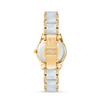 This statement piece features a Gold plated case with pearlescent acrylic inlays on the bracelet and a matching bezel.