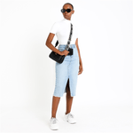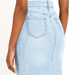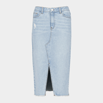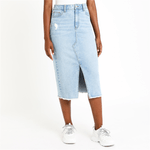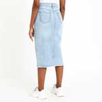 Perfect for warm sunny days, this denim midi skirt with front slit and frayed hem detail is a chic pick. Pair it with a crisp white t-shirt and your favourite sneakers. Midi length, Frayed hem, Zip up with button, Front pockets, Back pockets, Front slit