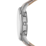 Emporio Armani's 43mm watch features a sunray copper dial with CD cut texture, chronograph movement and grey fabric strap.