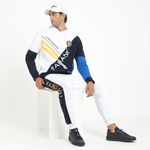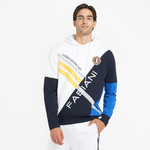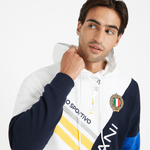 Elevate your casual style with this FLS Stripe and Colourblock Hoody in White. Made from 100% cotton which is lightweight and breathable yet cosy and warm, this hoody has a luxurious feel. Crisscross panelling and embroidered crests give it a sports-inspired feel. It features a lined hood with an adjustable drawstring and ribbing on the cuffs and hem.