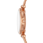 This beautiful Fossil ladies watch features a rose tone case with a mother-of-Pearl dial, Roman numerals and three-hand movement. Complemented with a stunning rose tone and mesh strap.