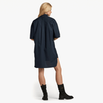 This short sleeved shirt dress offers different styling options through the 2-piece collar. By removing the flat collar, a band collar remains. Snap buttons are added to the placket below. This dress is designed in a straight fit, offering a loose design. The box pleat at the back creates ease of movement. An extended back and utility loops add character to this dress, while side seam pockets are just handy.