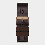 This stylish men’s watch features a brown Stainless Steel tonneau-shaped case, blue multi-function dial and brown genuine leather strap with a croc print, edged with silicone.