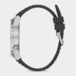 This sporty men’s watch features a Silver Plated Stainless Steel round case, black dial and black textured silicone strap.