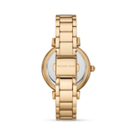 Michael Kors' Abbey 36mm watch features a white sunray dial with Gold-tone stick indexes, Gold-tone case with Gold-tone pave glitz topring, t-bar lugs, three-hand movement and Gold-tone stainless steel bracelet.