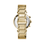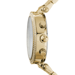 This Michael Kors Ladies Parker watch features a stunning gold tone stainless steel case with scratch resistant Mineral glass and a beautiful Gold coloured dial showcasing Baton hour markers and protected by a stone-set set bezel.
