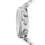 This sleek and chic timepiece is trimmed with sparkling pavé stones for an elegant, uptown sensibility. The brushed stainless steel bracelet and round face—offset by tone-on-tone grey accents—make for a timeless design, while sparkling pavé embellishments add a glamorous touch. Wear this feminine watch with everything in your closet.