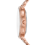 Michael Kors' 38mm Pyper watch features a white stamped logo dial with glitz indexes, rose Gold-tone case with pavé topring, three-hand movement and rose Gold-tone alloy bracelet.
