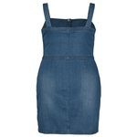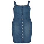 Perfect for warm sunny days, this denim bodycon dress with button detail is a chic pick. Pair it with a crisp white t-shirt or vest and your favourite sneakers. Bodycon fit, Shoulder straps, Front buttons, Side pockets, Midi length