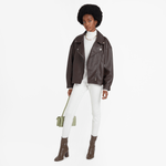 Leatherlike PU fabric, Classic biker style, Relaxed oversize fit, Diagonal zip, Front side pockets, Wide pointed collar
