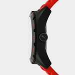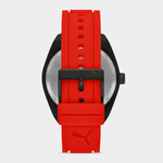 Puma's 48mm Puma Street V2 watch features a black textured dial, three-hand date movement and red silicone strap.