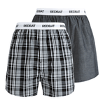 This Redbat Black Check Woven Boxer pack includes two pairs of men's classic boxers. They are made from a lightweight and breathable cotton blend in a short, mid-thigh cut and feature a comfortable elastic waistband with repeat Redbat branding. One pair is solid grey while the other is a grey check design. Redbat is available exclusively at sportscene.