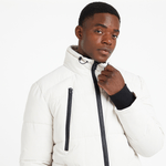 This Relay Jeans Funnel Ecru Puffer Jacket has a sportswear-inspired feel with a bold monochrome colourway featuring black detail on white. It has chunky zips on the chest and through the middle complemented by black ribbing on the cuffs and black mesh inserts on the lower pockets. It has a lined hood with adjustable elasticated drawstrings for extra coverage when you need it.