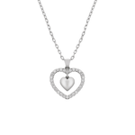 This petite Sterling Silver pendant on chain features an open heart design with a pave Cubic Zirconia setting, accentuated with a small dangling heart in the centre.