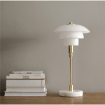 This statement lamp will elevate your side table or desk with its chic art deco-inspired design. It has a gold metal and marble base completed by a striking 3-tired opal glass shade.