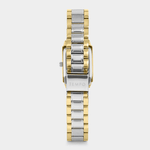 This elegant women’s watch features a Gold Plated rectangle case, sleek silver dial and two-tone bracelet strap.