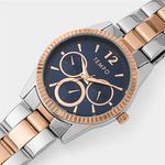 This stylish women’s watch features a round Silver Plated case, Rose Gold Plated coin edge bezel, blue multi fashion dial and two-tone bracelet strap.