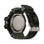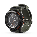 This green camouflage print men’s sports watch features a round resin case, analogue and digital multi-function dial and sturdy resin strap. Special features include 5ATM water resistance, multiple time zones, a stop watch, shock resistance, date and time display, back light and an alarm.