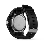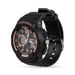 This black and Rose Gold toned men’s sports watch features a round resin case, digital multi-function dial and sturdy resin strap. Special features include 5ATM water resistance, multiple time zones, a stop watch, shock resistance, date and time display, back light and an alarm.