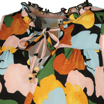This midi dress with tiering, tie neck with frills and sleeveless design in a beautiful abstract print will look great paired with sandals and a straw hat.