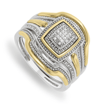 Expertly crafted in 5ct yellow Gold & Sterling Silver, this majestic two-tone triple set ring features a cushion-shaped cluster of Diamonds and created white Sapphires in a radiant halo setting and elegantly curved bands enhanced by intricate beading. Available in ring size P, K, U.
